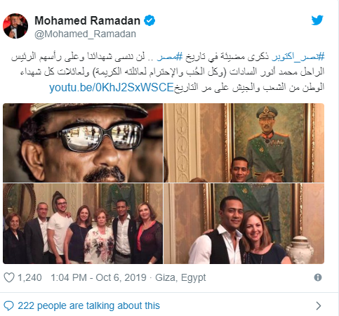 وقال محمد رمضان: "نصر أكتوبر ذكرى مضيئة في تاريخ مصر.. لن ننسى شهداءنا وعلى رأسهم الرئيس الراحل محمد أنور السادات (وكل الحُب والاحترام لعائلته الكريمة) ولعائلات كل شهداء الوطن من الشعب والجيش على مر التاريخ".