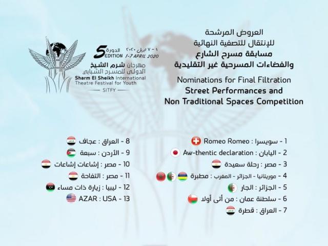 وتواصل حاليا لجنة المشاهدة بالمهرجان أعمالها لتختار القائمة النهائية والتي تتكون من المخرجة كريمة بدير والفنان طارق صبري والمخرج سامح مجاهد والدكتور ياسر علام والسينو غرافي محمود صبري ومن العروض المختارة في التصفية الحالية في مسابقة العروض الكبرى من مصر عروض (انتظار) و(أغنية الموت) و(القطة العميا) و(نزهة في أرض المعركة) و(حذاء مثقوب تحت المطر).