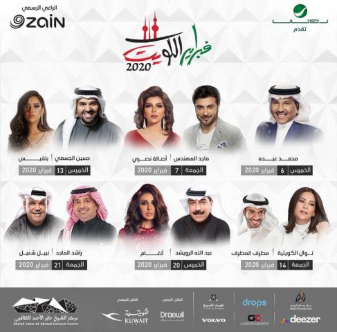 ويتبادل النجوم الحفلات بين الفترة من 6 وحتى 21 فبراير المقبل، ويحيي محمد عبده حفله يوم الخميس 6 فبراير على مسرح مركز الشيخ جابر الأحمد الثقافي، وفي اليوم التالي يحيي كل من ماجد المهندس وأصالة نصري حفلهما على ذات المسرح.