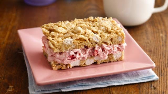 نضع بعض من آيس كريم الفراولة بين قطعتين من البسكويت ثم نقدم ساندويتش آيس كريم بالفراولة.