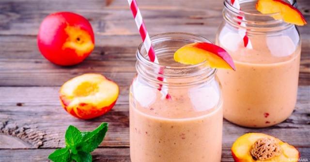 في الخلاط ضعي الفراولة و الخوخاسكبي الحليب وضيفي جوز الهند والفانيلياأضيفي العسل وكريمة الخفقاضربي المكونات معا حتى تمتزج وقدميه طازجًا .