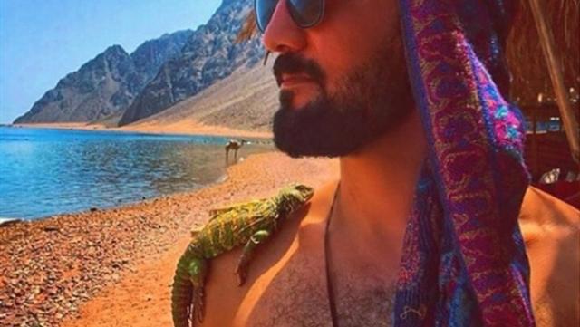 وظهر" حسني في الصورة المرعبه حيث كانت يقف علي كتفه سحليه لونها خضراء مريبة من زواحف الصحراء الغريبة.