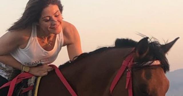 هيدى كرم تستعرض مهاراتها فى ركوب الخيل على شاطئ البحر (فيديو وصور)