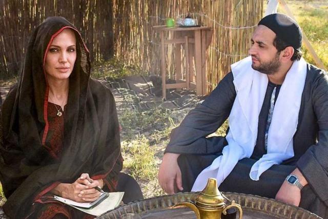 يتحدث عن صورة مصطفى خاطر وأنجلينا جولي، قال: «تخيلت خاطر بملابسه الصعيدية في أحد أدواره وهو يجلس بجوار النجمة العالمية، ولكن كان من الضروري البحث عن صورة لها بملابس عربية، وهذا ما حدث، فاستعنت بصور من جولتها في المنطقة العربية، وتوصلت لها وعلى الفور بدأت في التصميم، وظهر الثنائي في صورة وكأنهما يقدمان دورًا في صعيد مصر».