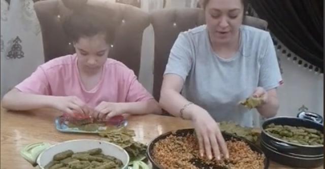و ظهرت مروة عبد المنعم في تحدي لف المحشي مع ابنتها و علقت قائلة :حور لفت ورق عنب مايجي نشوف.