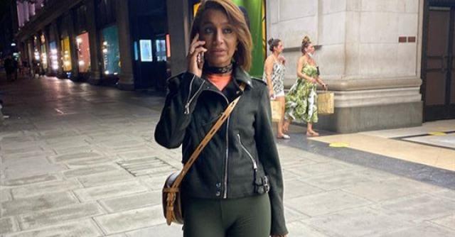 وظهرت الإعلامية بسمة وهبي في الصورة وهي تتحدث في الهاتف وترتدي جاكت جلد أسود وشورت.